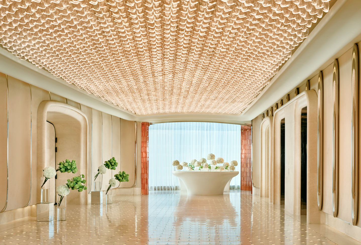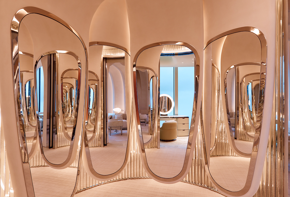 Mirrored leather panels in soft petal shapes encircle the dressing room, ensuring you look flawless from every angle.